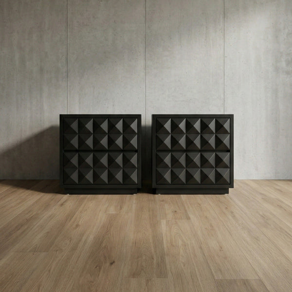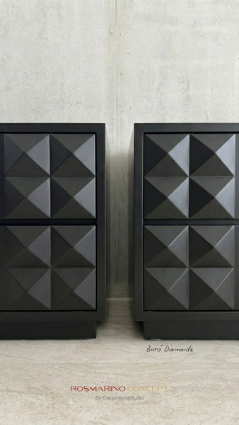 Night stand manufactured in solid parota wood with diamond drawers. Finished in polyurethane laquer.